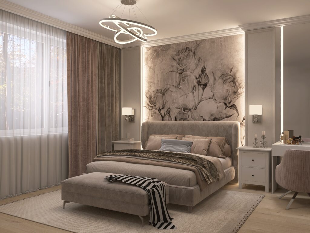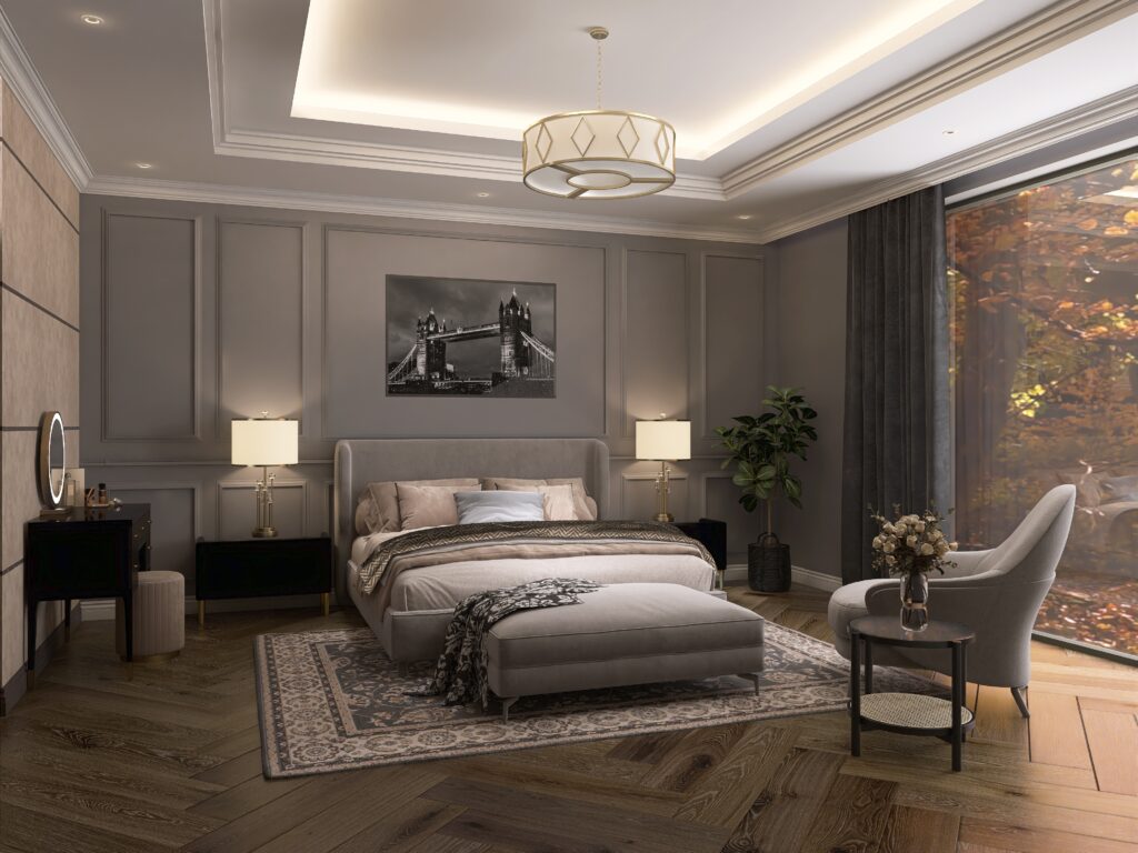 Ein stimmungsvolles Schlafzimmer, das klassische Elemente mit Modernität verbindet